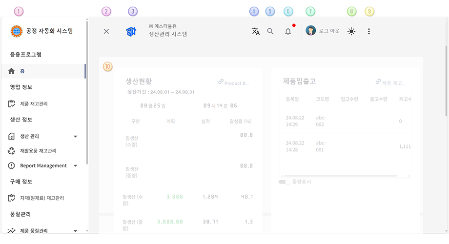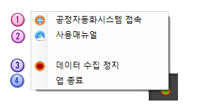 아래 이미지는 공정자동화 시스템앱 메인화면을 보여 줍니다. 사용자 권한에 따라 표시 방법이 달라 지며 권한이 없는 항목을 클릭 할 경우 오류를 표시하게 됩니다.