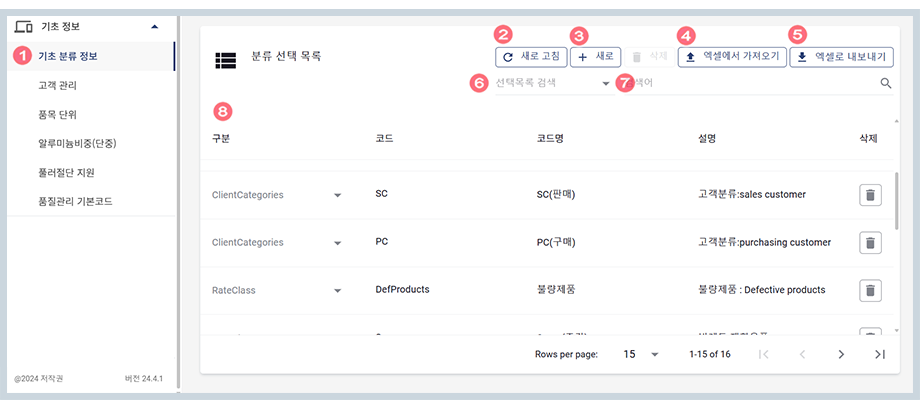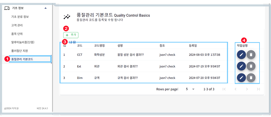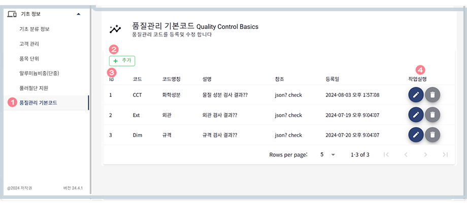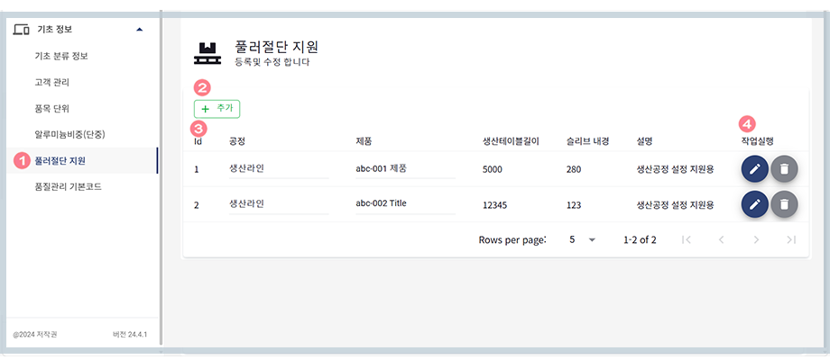 앱에서 사용하는 생산관련 기본 정보를 등록 관리 합니다