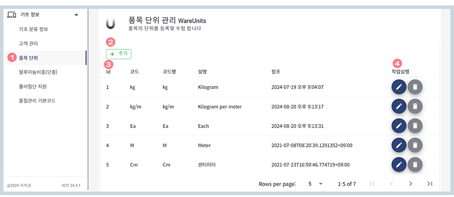 여러 모듈(프로그램)에서 사용하는 품목 단위 코드에 대하여 추가 입력및 수정합니다