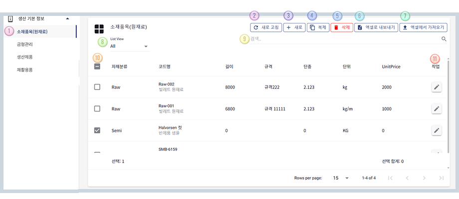 사이드메뉴에서 클릭하게되면 위 그림과 같이 품목 단위 화면이 표시 됩니다.