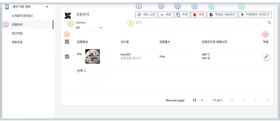 사이드메뉴에서 클릭하게되면 위 그림과 같이 금형관리 화면이 표시 됩니다.