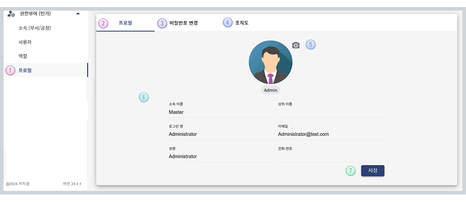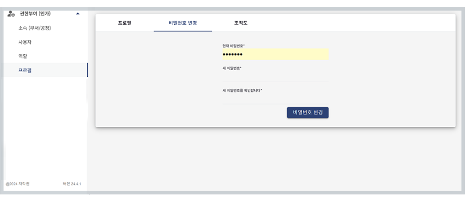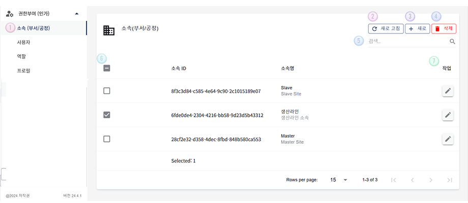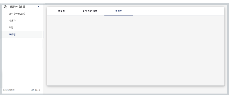 사이드메뉴에서 클릭하게되면 위 그림과 같이 소속(부서/공정) 화면이 표시 됩니다.