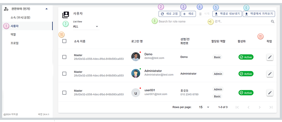 사이드메뉴에서 클릭하게되면 위 그림과 같이 역할 화면이 표시 됩니다.